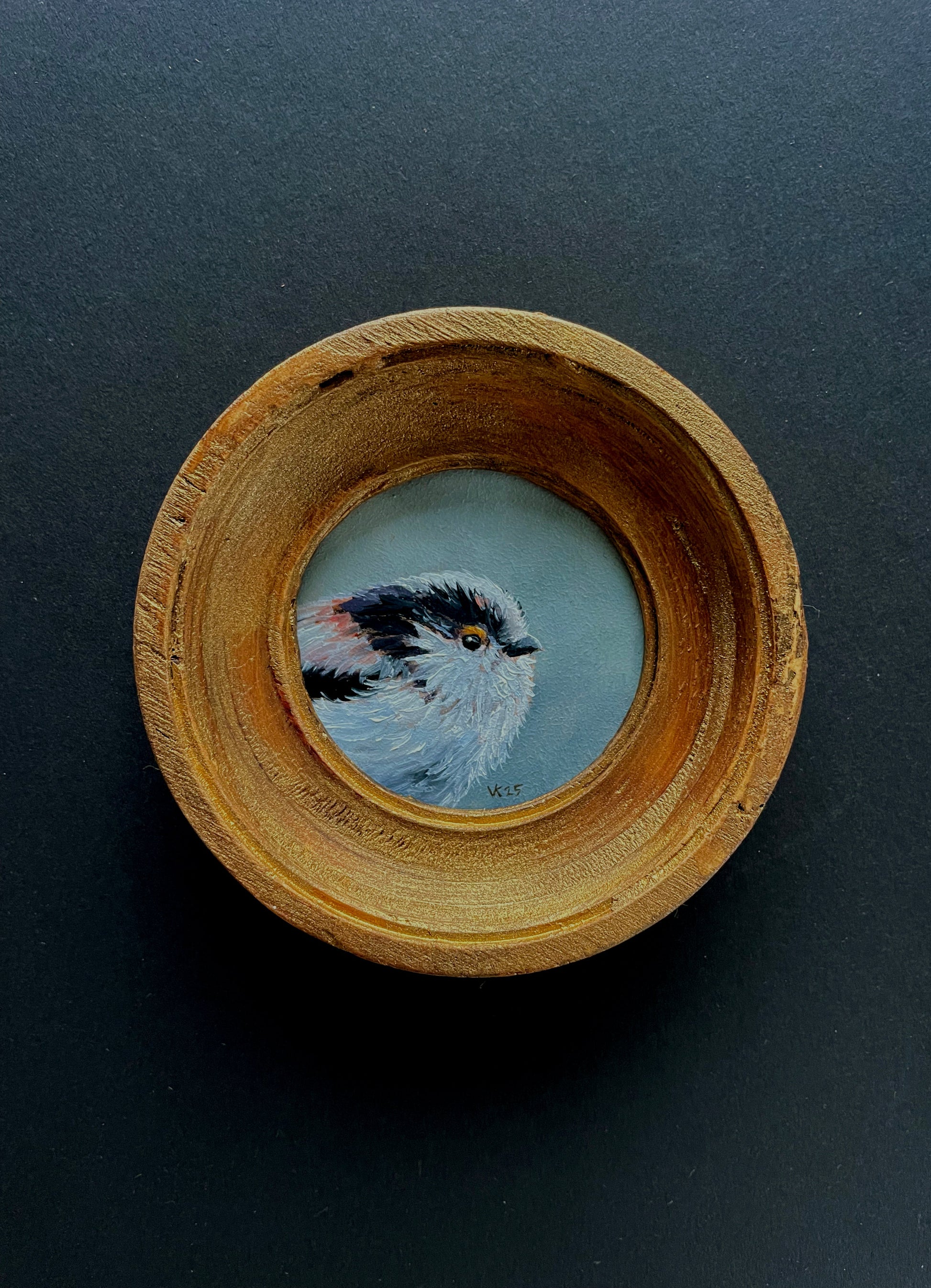 Ik word gelukkig van vogels. Jij ook? Deze staartmees schilderde ik op een rond paneeltje, in een zelfgemaakte ronde lijst.