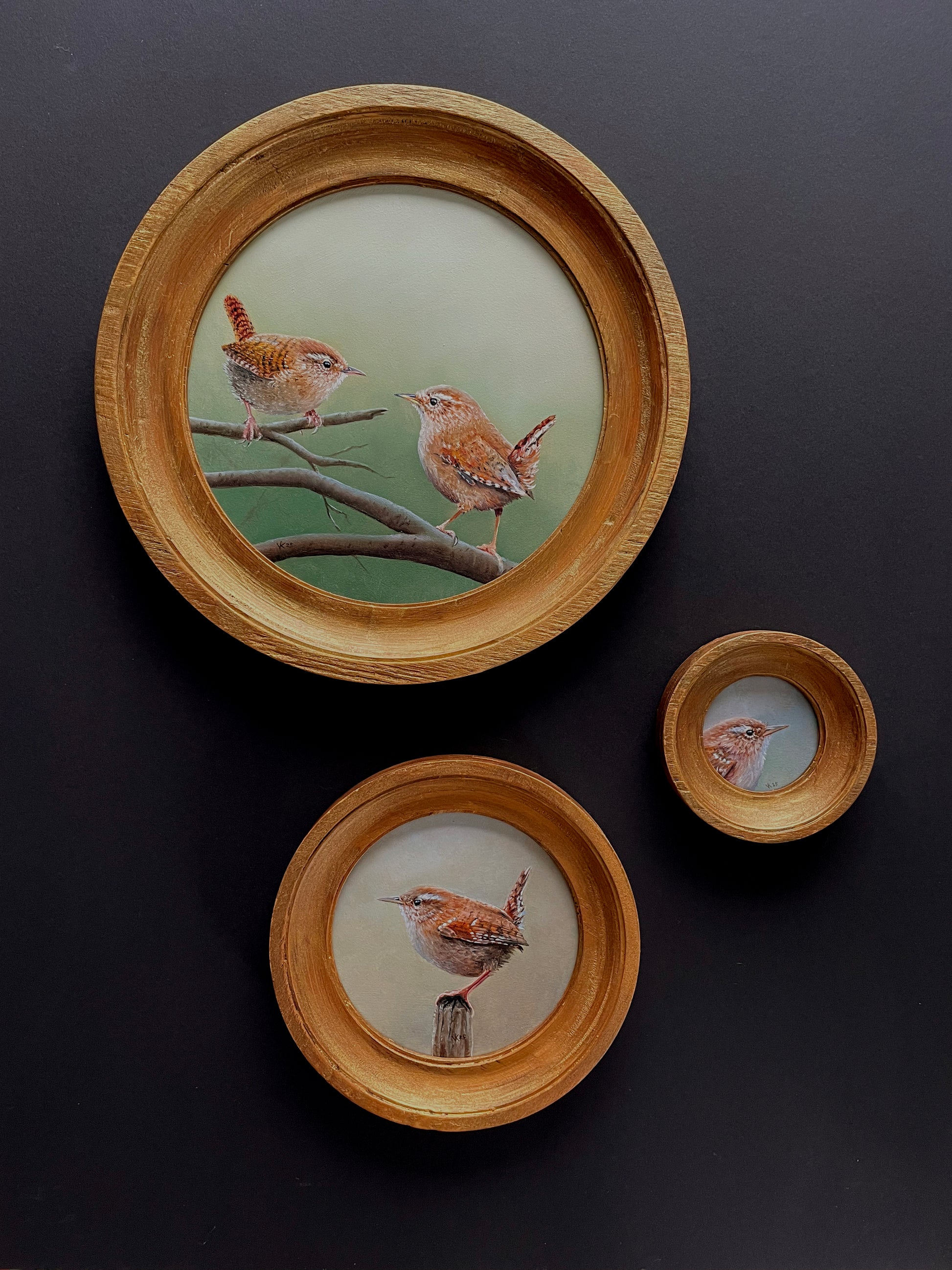 Ik word gelukkig van vogels. Jij ook? Deze winterkoning schilderde ik op een rond paneeltje, in een zelfgemaakte ronde lijst.