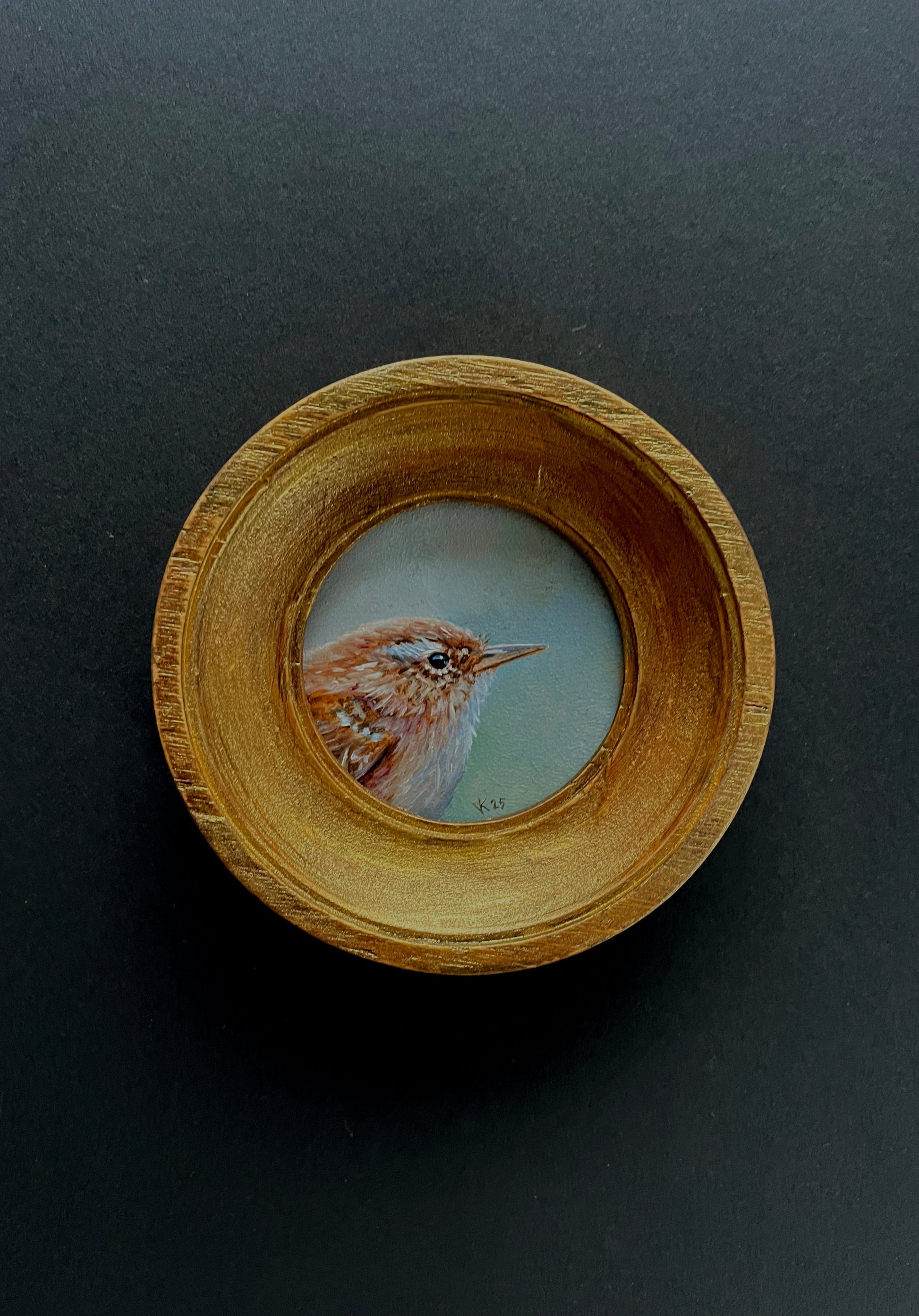 Ik word gelukkig van vogels. Jij ook? Deze winterkoning schilderde ik op een rond paneeltje, in een zelfgemaakte ronde lijst.