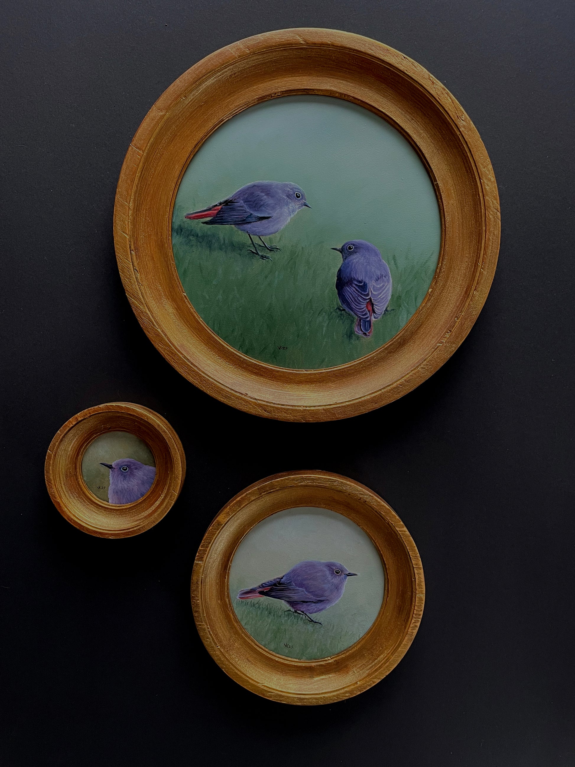 Ik word gelukkig van vogels. Jij ook? Deze zwarte roodstaart schilderde ik op een rond paneeltje, in een zelfgemaakte ronde lijst.